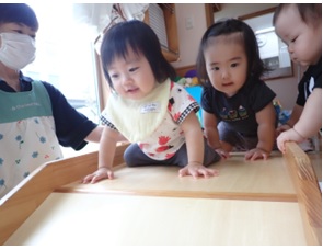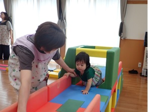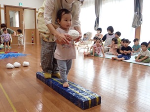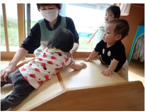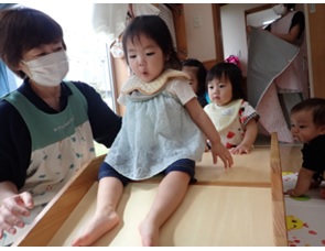 パンダ組も、保育士と一緒に挑戦しま