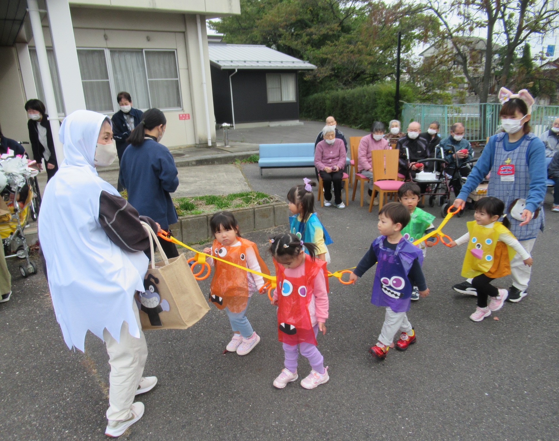 | ~きらきらげんき保育園の皆さんがハロウィンパレードに来てくれました~ 令和6年10月31日、きらきらげんき保育園の皆さんが仮装してハロウィンパレードに来てくれました。かわいい皆さんの仮装・表情にご利用者の皆さんうっとりとされ目が離せませんでした。「かわいいね」「元気いっぱいもらったね♪」 と喜びの声が聞かれました。中には泣いて喜ばれる方もいました。ハッピーハロウィンの掛け声とともに記念撮影もさせていただき、感無量です。きらきらげんき保育園の皆さん本当にありがとうございました。またお会いできることを楽しみにしています。 |