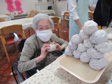 | ~団子ならし・初釜~ 平成27年1月15日、団子ならし・初釜を行いました。ご利用者の皆さんの無病息災を願って、木の枝々に色とりどりの団子をつけました。「初めてやった」「おもしろいね」との声が聞かれました。また、皆さんで抹茶や和菓子を楽しんでいただき、「正月らしいね」といつもより話も弾み喜ばれていました。今年も皆さん健康でありますように…。 |
